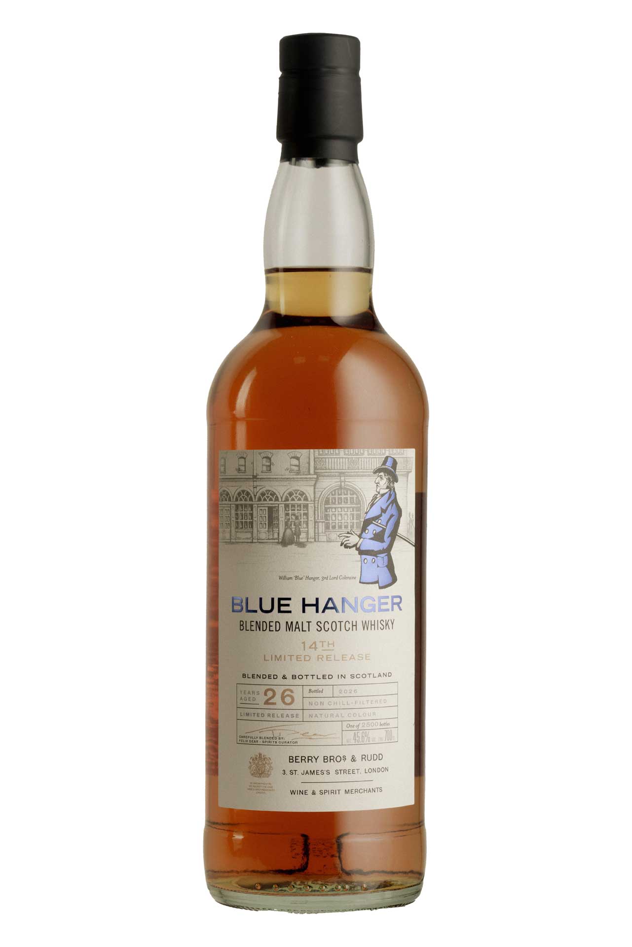 Nun, mehr als ein Jahrzehnt nach der letzten Veröffentlichung, wurde die Serie von Felix Dear, dem Nachfolger von Doug McIvor und jetzigen Spirituosen-Kurator von Berry Bros. & Rudd, mit dem 14th Release wieder zum Leben erweckt. Die 14. Ausgabe des „Blue Hanger“ ist eine Komposition aus gereiften Malt Whiskys, von denen der jüngste 26 Jahre alt ist. Die Mischung wurde aus sieben Fässern zusammengestellt: sechs ehemaligen Bourbon-Hogsheads und einem ehemaligen Sherry-Butt.